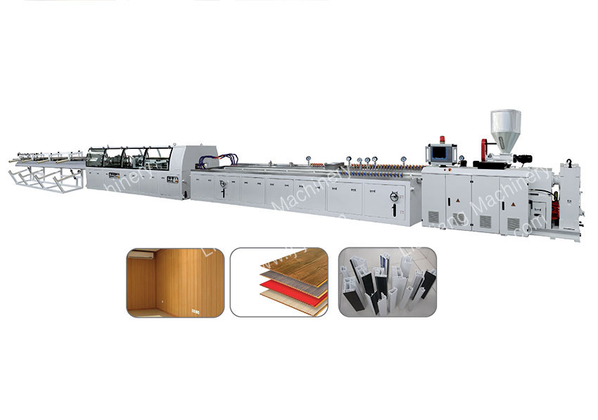 該生產線主要用于生產天花板,集成吊頂,外墻掛板,扣板腳線等。該設備由雙螺桿擠出機,真空定型臺,牽引機,全自動切割機,翻料平臺等構成。主機產量可根據客戶要求進行選配,該生產線工作平穩,可靠性好,得到了廣大客戶的一致好評。